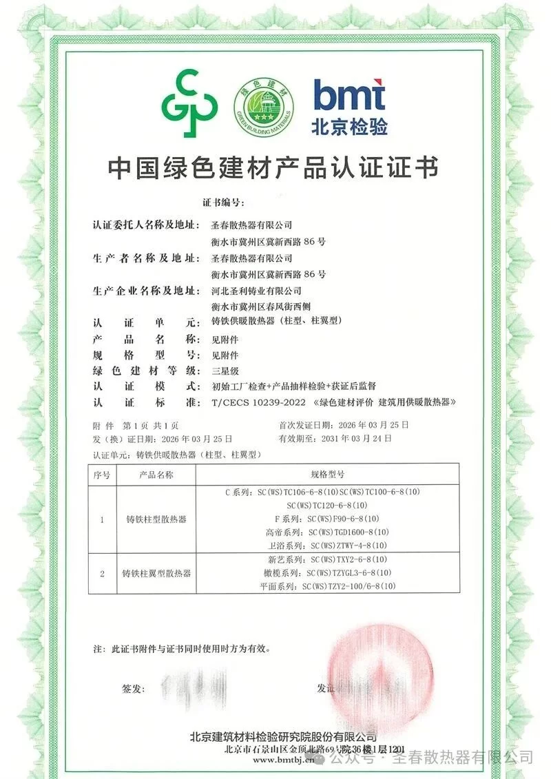 Recently, three major product series of Shengchun Radiator Co., Ltd. under Chunfeng Industrial Group — steel heating radiators, cast iron heating radiators, and composite heating radiators — have successfully been awarded the Three-Star Certification for China Green Building Materials Products following rigorous testing and evaluation by the Beijing Building Materials Inspection Institute.