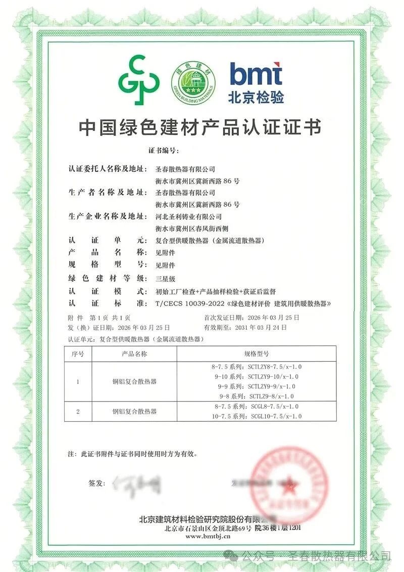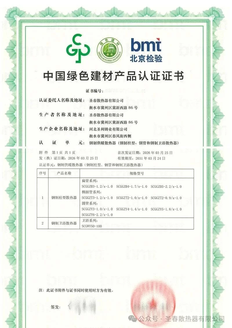 Adhering to the philosophy of “green production, quality first”, Shengchun Radiator has been deeply engaged in the heating industry for many years, continuously optimizing production processes, improving product energy efficiency, and reducing environmental impact. The simultaneous attainment of the highest-level green certification for all three series represents high recognition from authoritative institutions for Shengchun’s product quality, environmental standards, and technical strength, while also providing reliable guidance for consumers choosing healthy, energy-saving, and eco-friendly heating products.